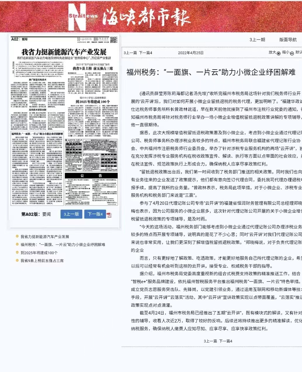 福州日报 福州税务:“一面旗、一片云”助力小微企业纾困解难