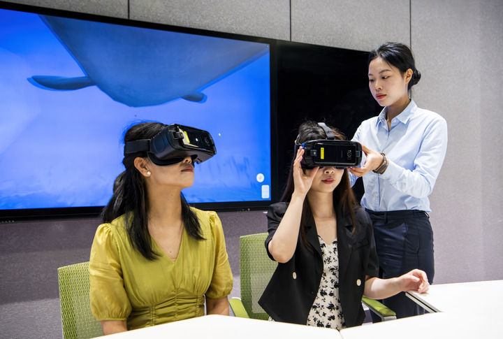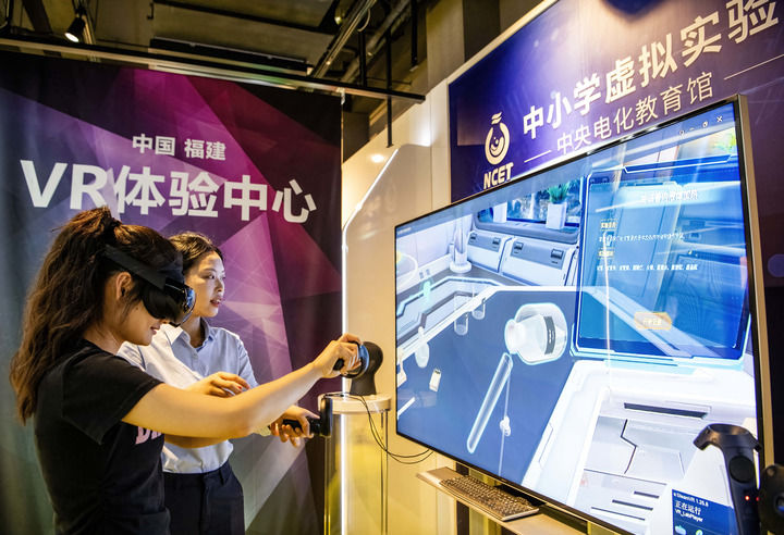 在网龙网络公司的中国福建VR体验中心,两名参观者在体验VR“智慧教室”。作为国内最早将AI引入教育领域的企业之一,网龙公司拓宽数字领域多元应用,先后打造“AI课件”“智慧教室”等(7月17日摄)。