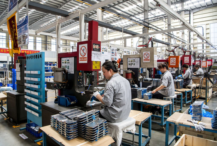 在福建骏鹏智能制造有限公司自动化钣金车间,工人们在自动化机床上制造新能源汽车电池包配件(7月17日摄)。