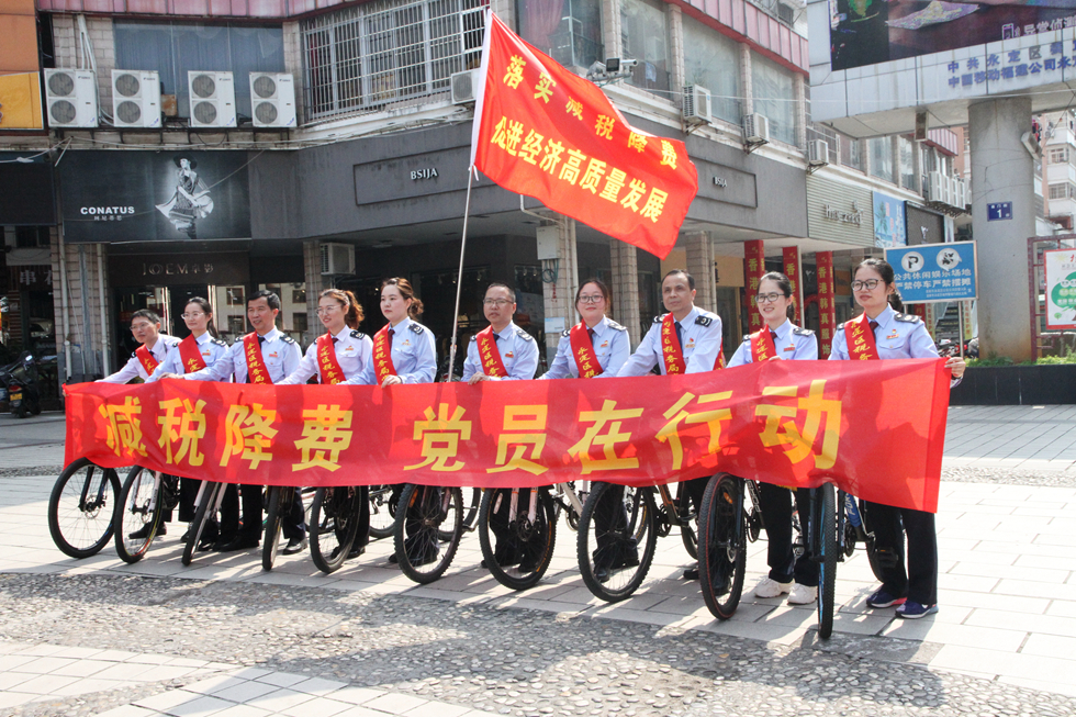4月24日,永定区税务局一支由党员先锋队成员组成的税收宣传骑行队伍,在城区开展“绿色骑行送税法”主题宣传活动。税务干部举着印有“落实减税降费促进经济高质量发展”税收宣传标语的旗帜,骑行穿梭于永定区大街小巷之中,将税收宣传平台“流动”起来,大力宣传便民办税举措和最新税收政策,为促进经济高质量发展营造良好的宣传氛围。