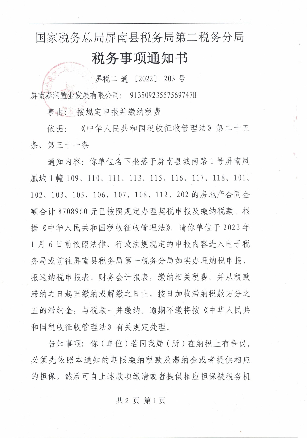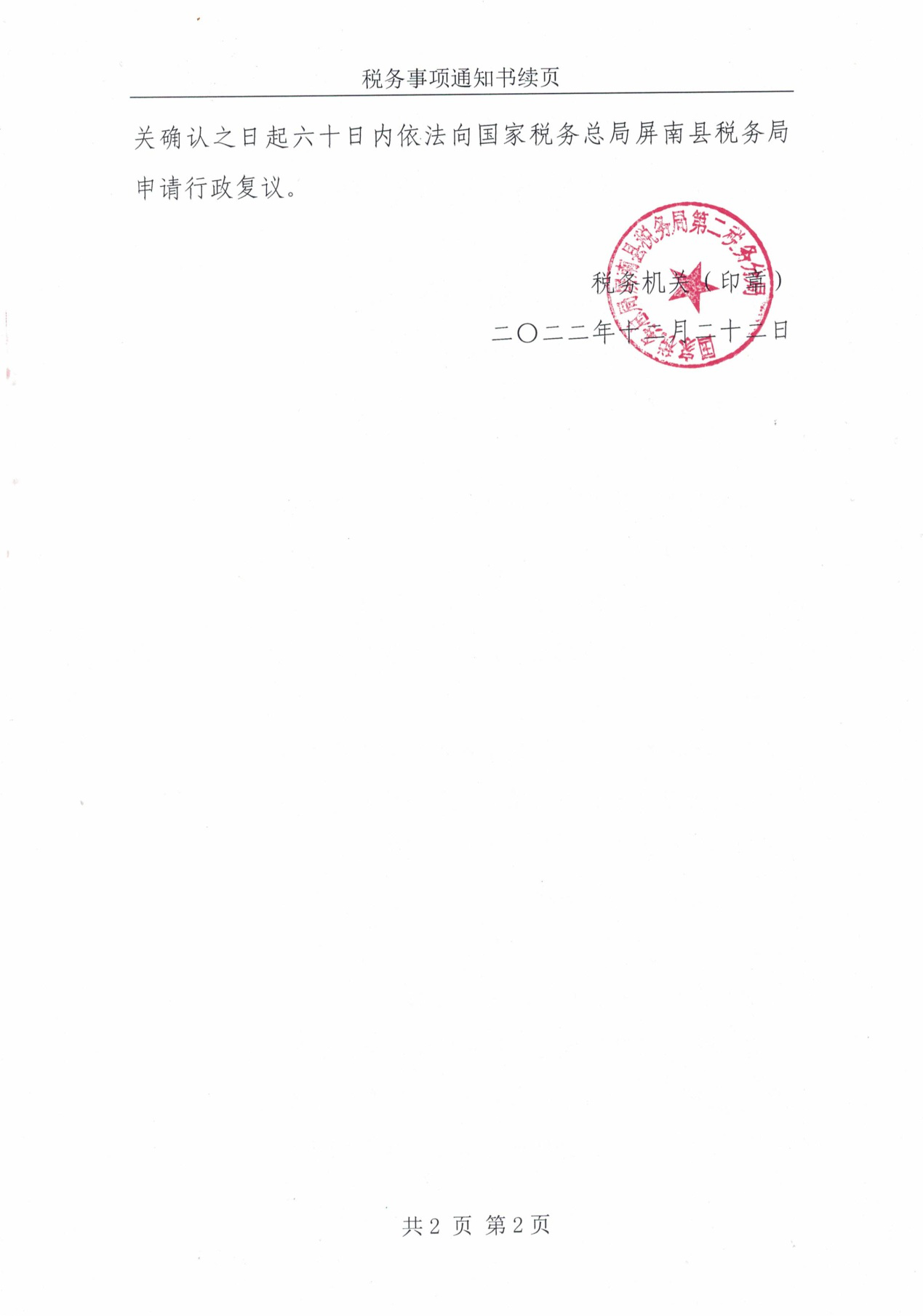 附件:《国家税务总局屏南县税务局第二税务分局税务事项通知书》(屏税二通〔2022〕203号)