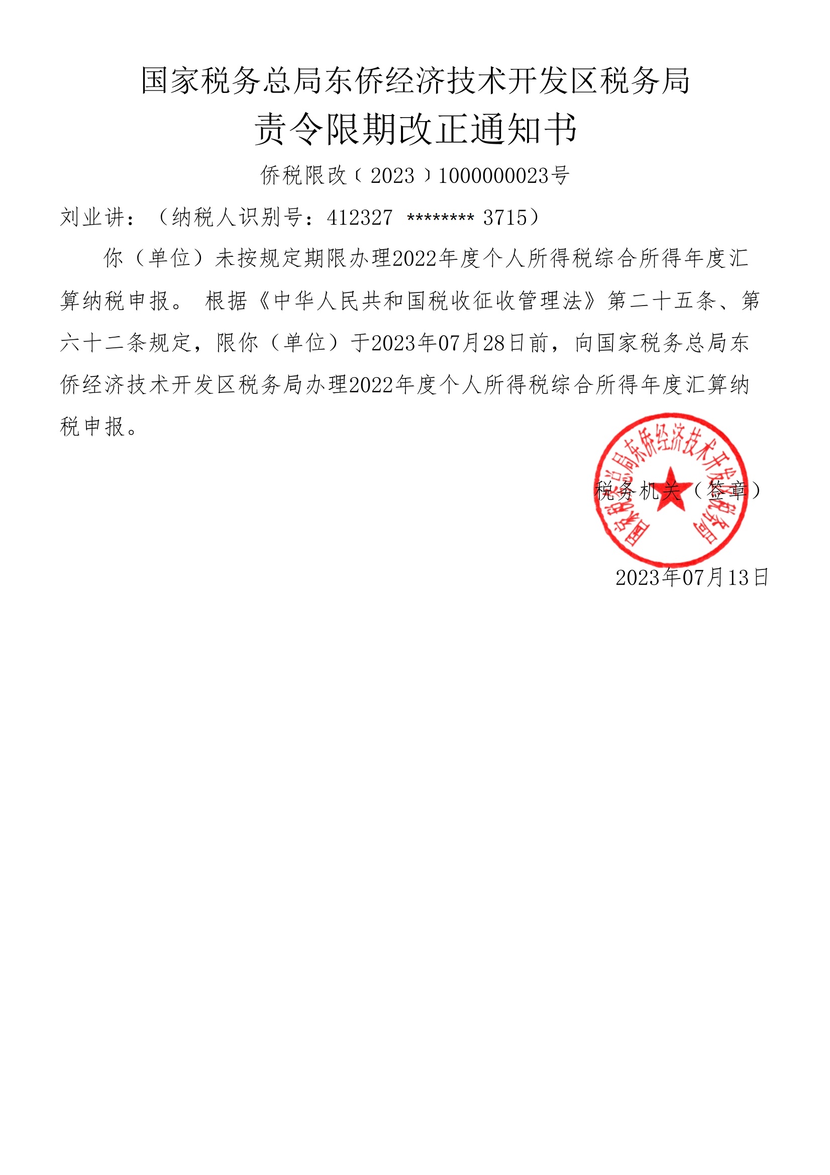 | 刘业讲 | 412327********3715 | 侨税限改(2023)1000000023号 |