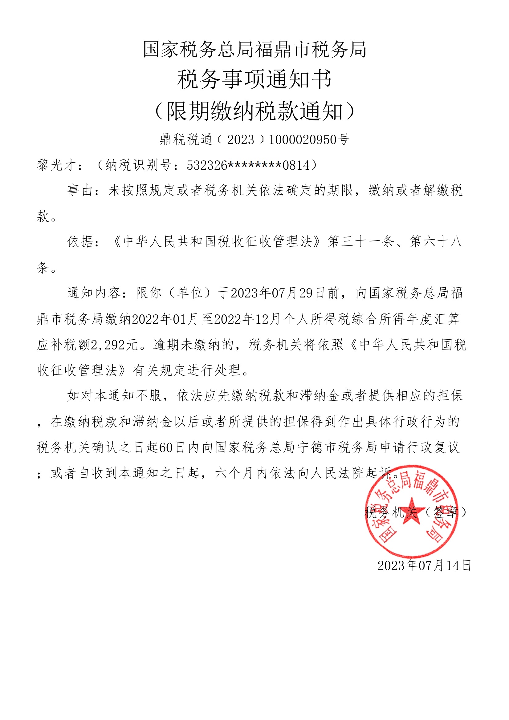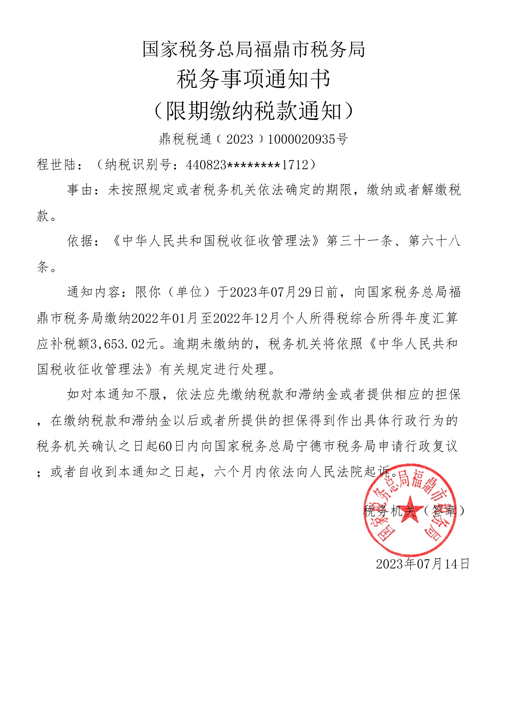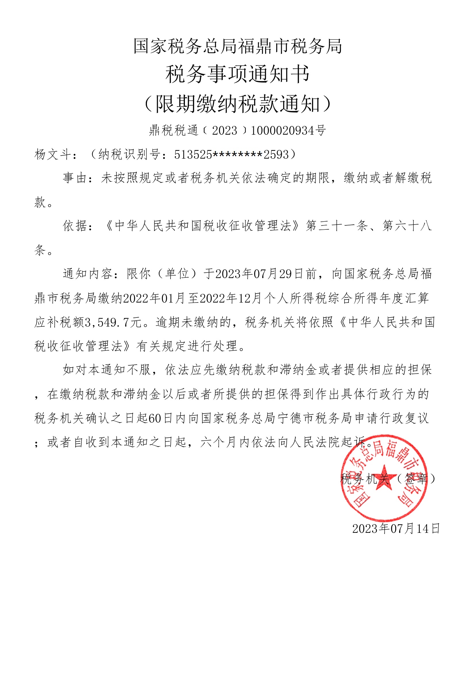 因附件所列的9份2023年7月份的《税务事项通知书》(限期缴纳税款通知)采取邮寄送达等方式无法送达,现根据《中华人民共和国税收征收管理法实施细则》第106条规定,将其予以公告送达,自公告之日起满30日视为送达。公告中的纳税人识别号已做脱敏处理,具体税务文书可到办税大厅或主管税务机关领取。