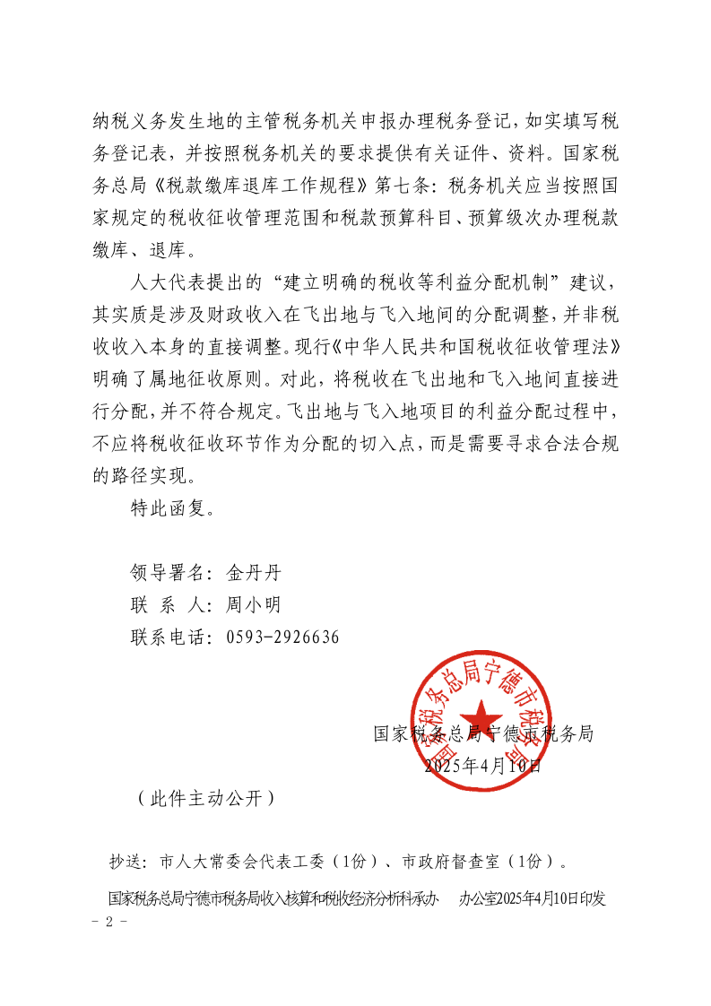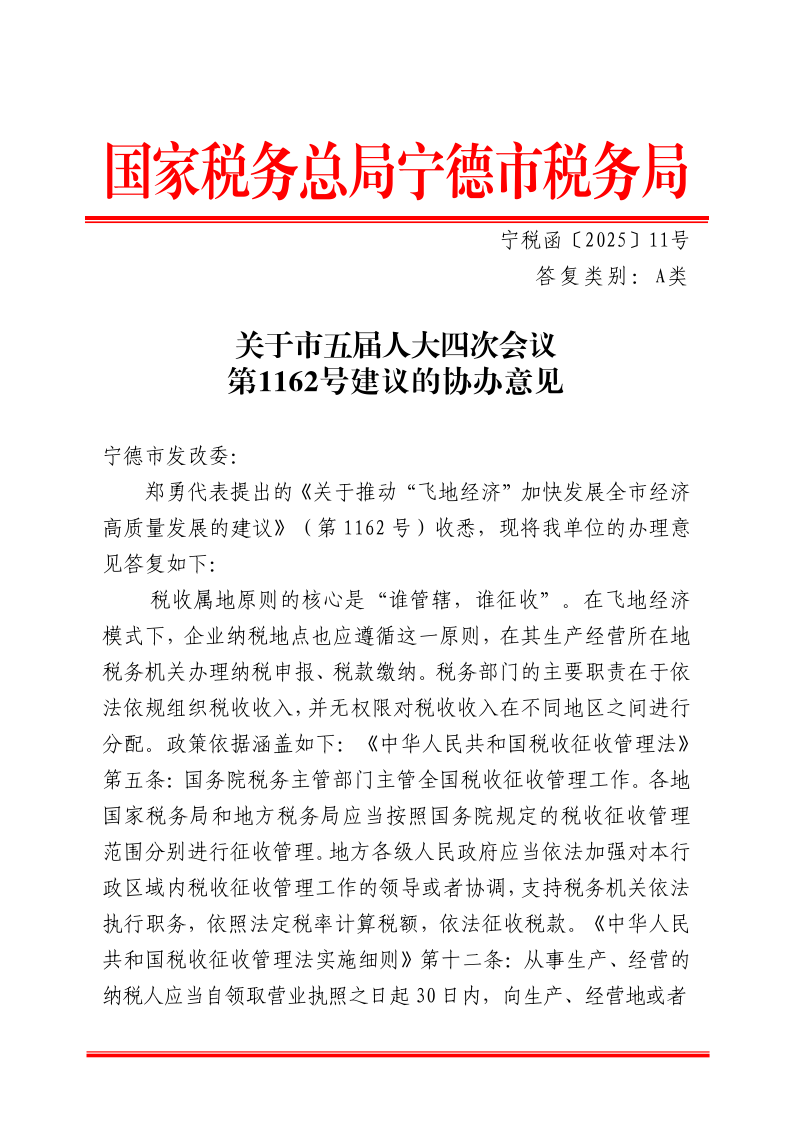 国家税务总局宁德市税务局关于市五届人大四次会议第1162号建议的协办意见