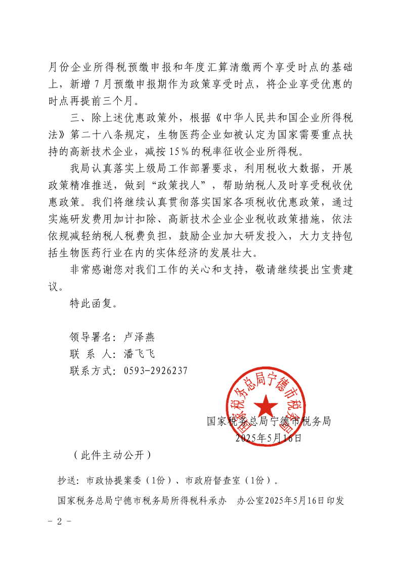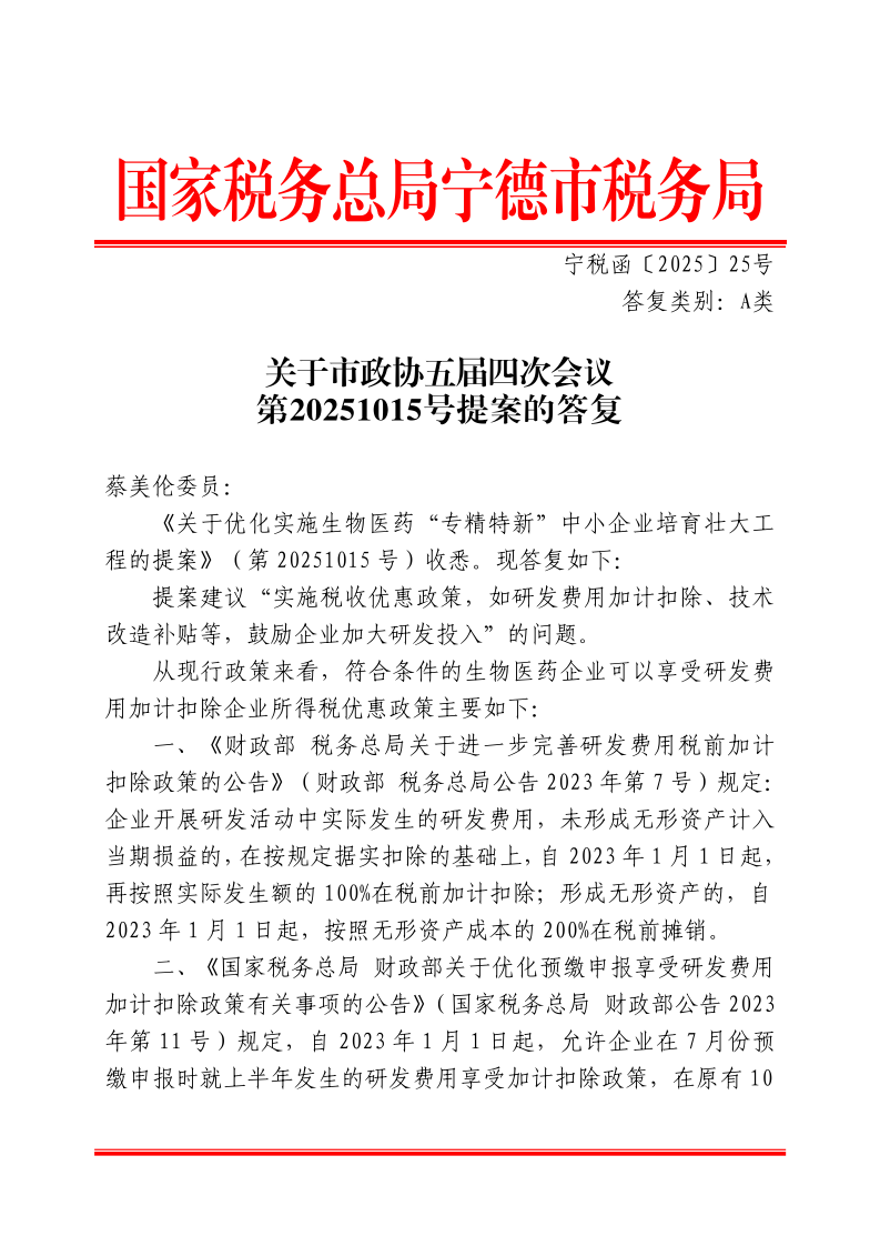 国家税务总局宁德市税务局关于市政协五届四次会议第20251015号提案的答复