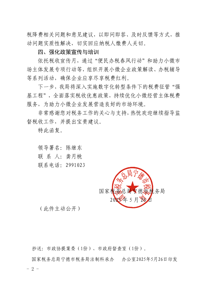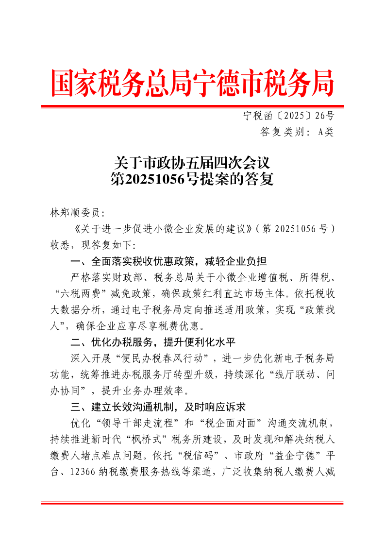 国家税务总局宁德市税务局关于市政协五届四次会议第20251056号提案的答复