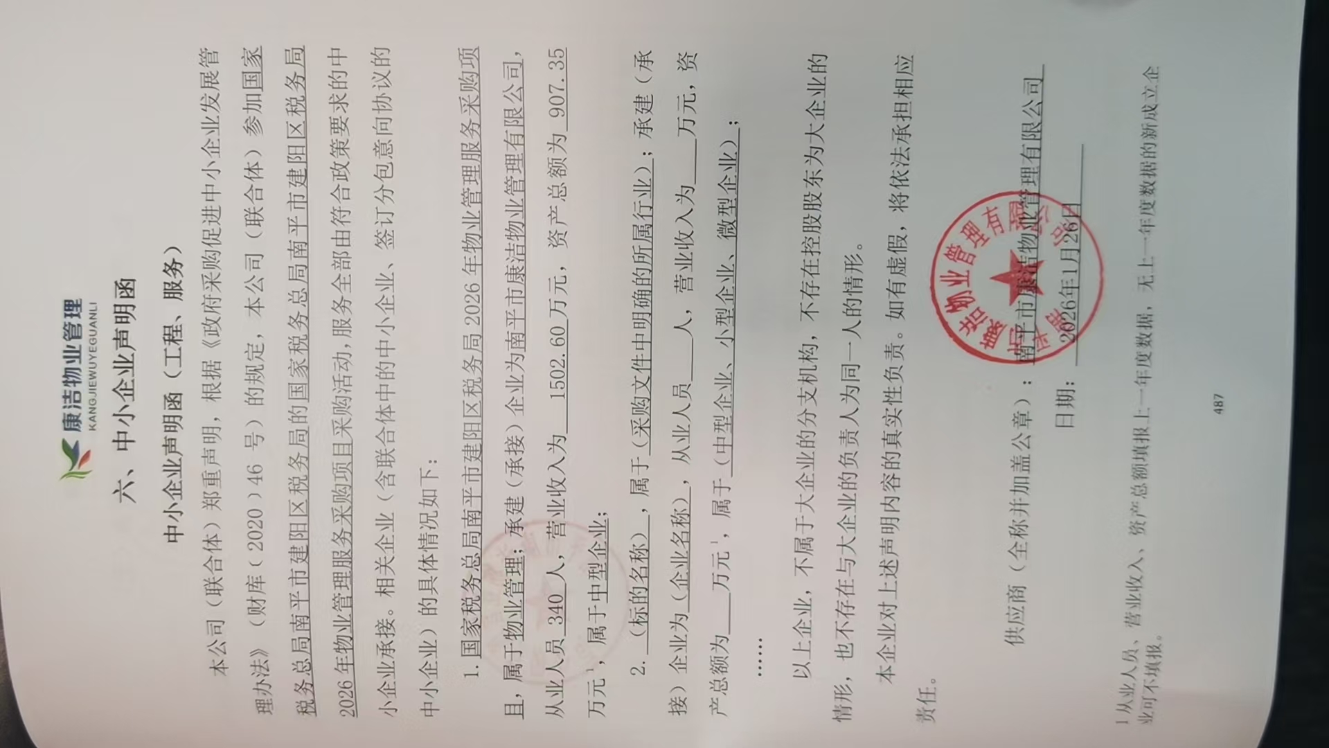 二、项目名称:国家税务总局南平市建阳区税务局2026年物业管理服务采购项目