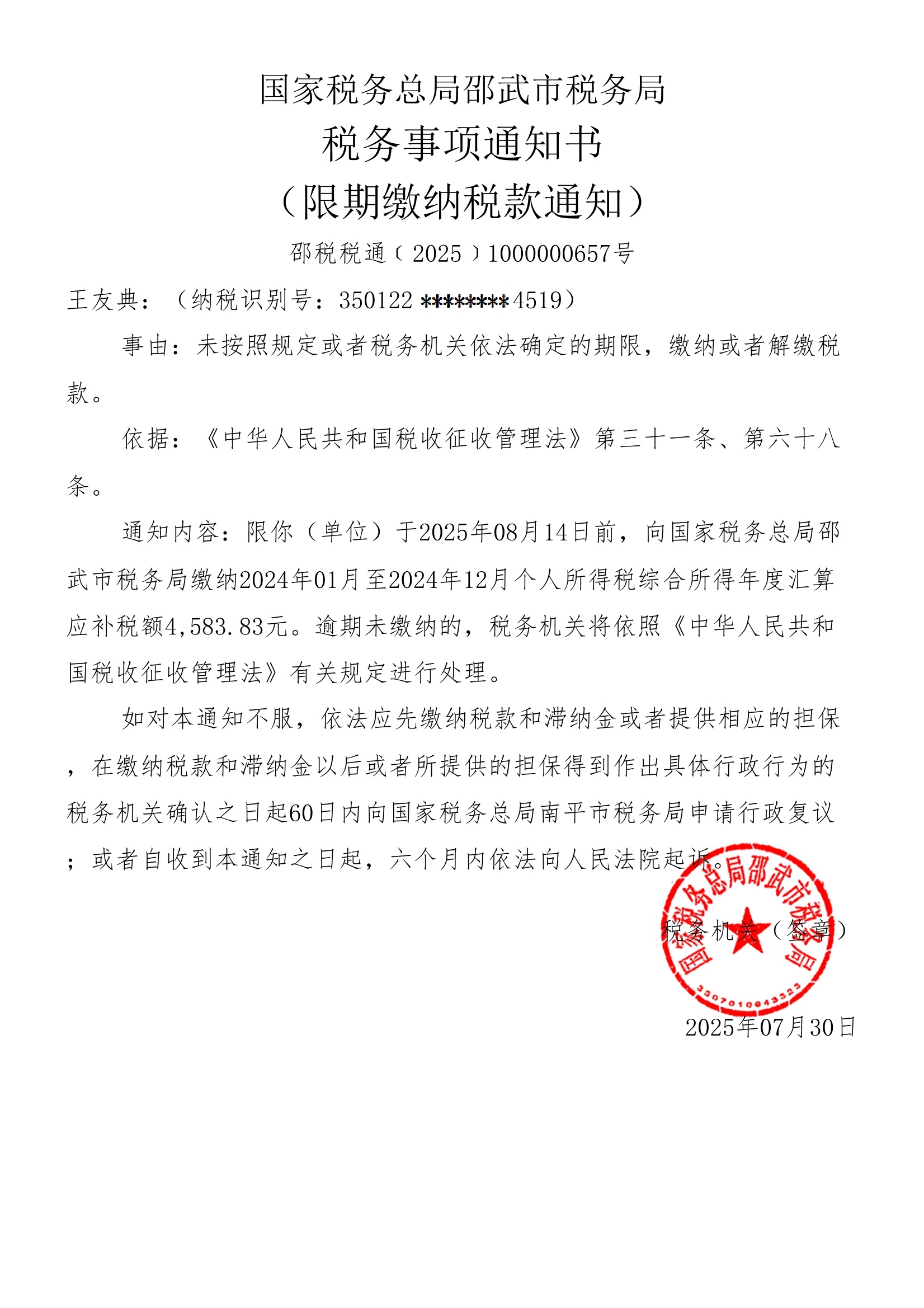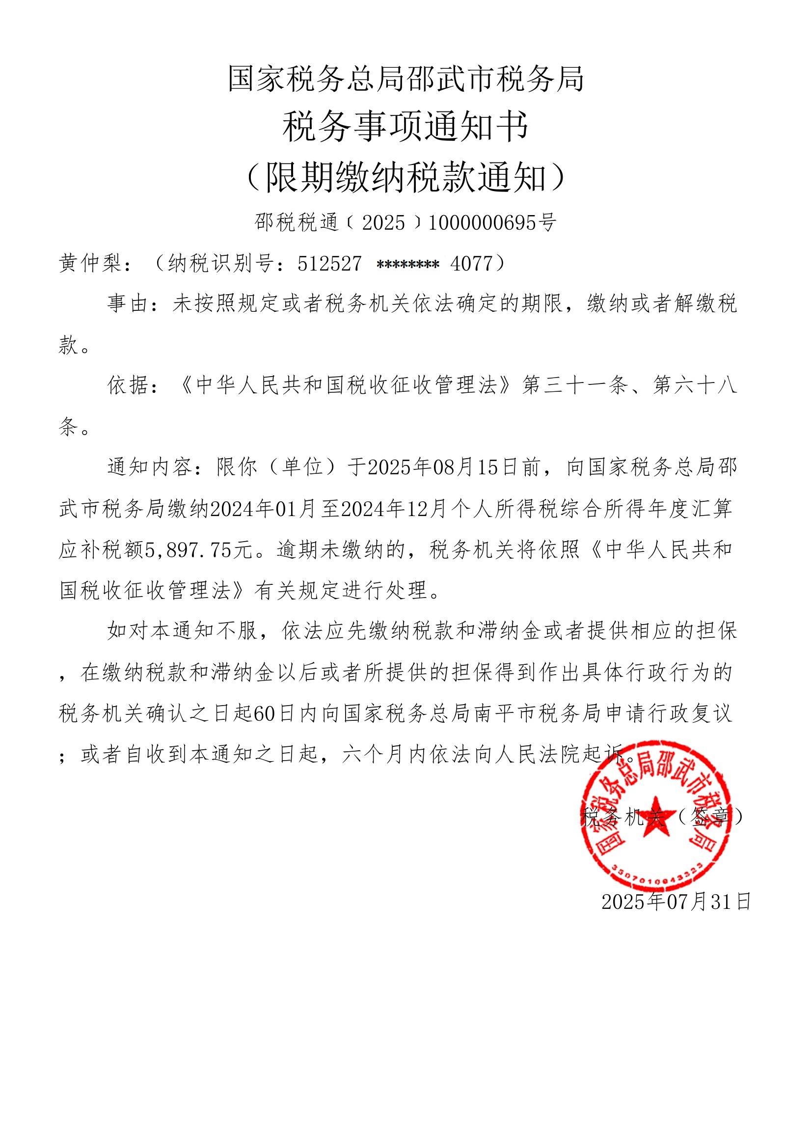 附件:1.《税务事项通知书》(限期缴纳税款通知)(邵税税通﹝2025﹞1000000657号)