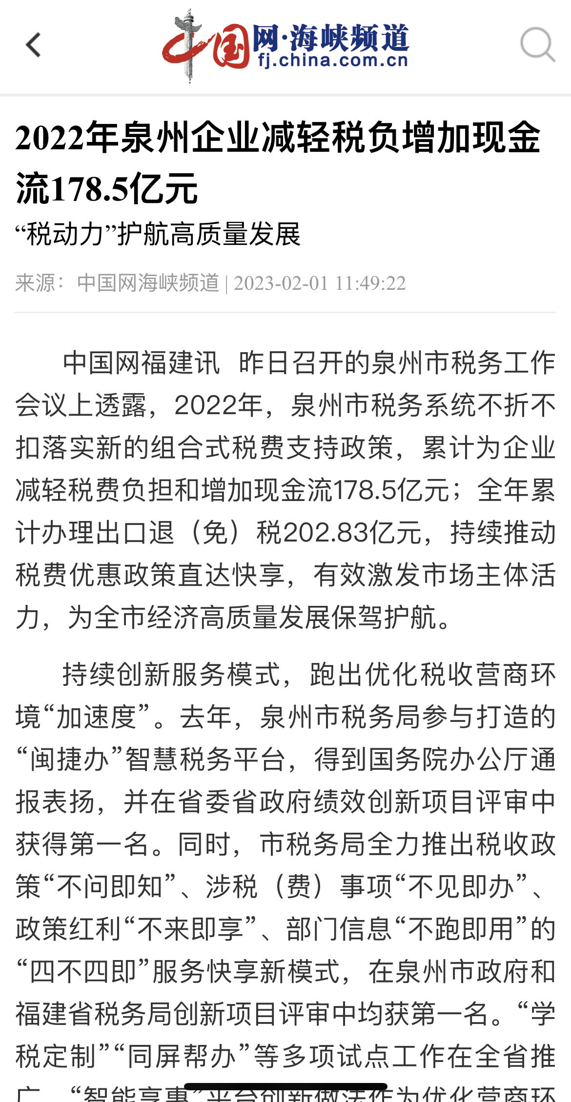 昨日召开的泉州市税务工作会议上透露,2022年,泉州市税务系统不折不扣落实新的组合式税费支持政策,累计为企业减轻税费负担和增加现金流178.5亿元;全年累计办理出口退(免)税202.83亿元,持续推动税费优惠政策直达快享,为全市经济高质量发展保驾护航。