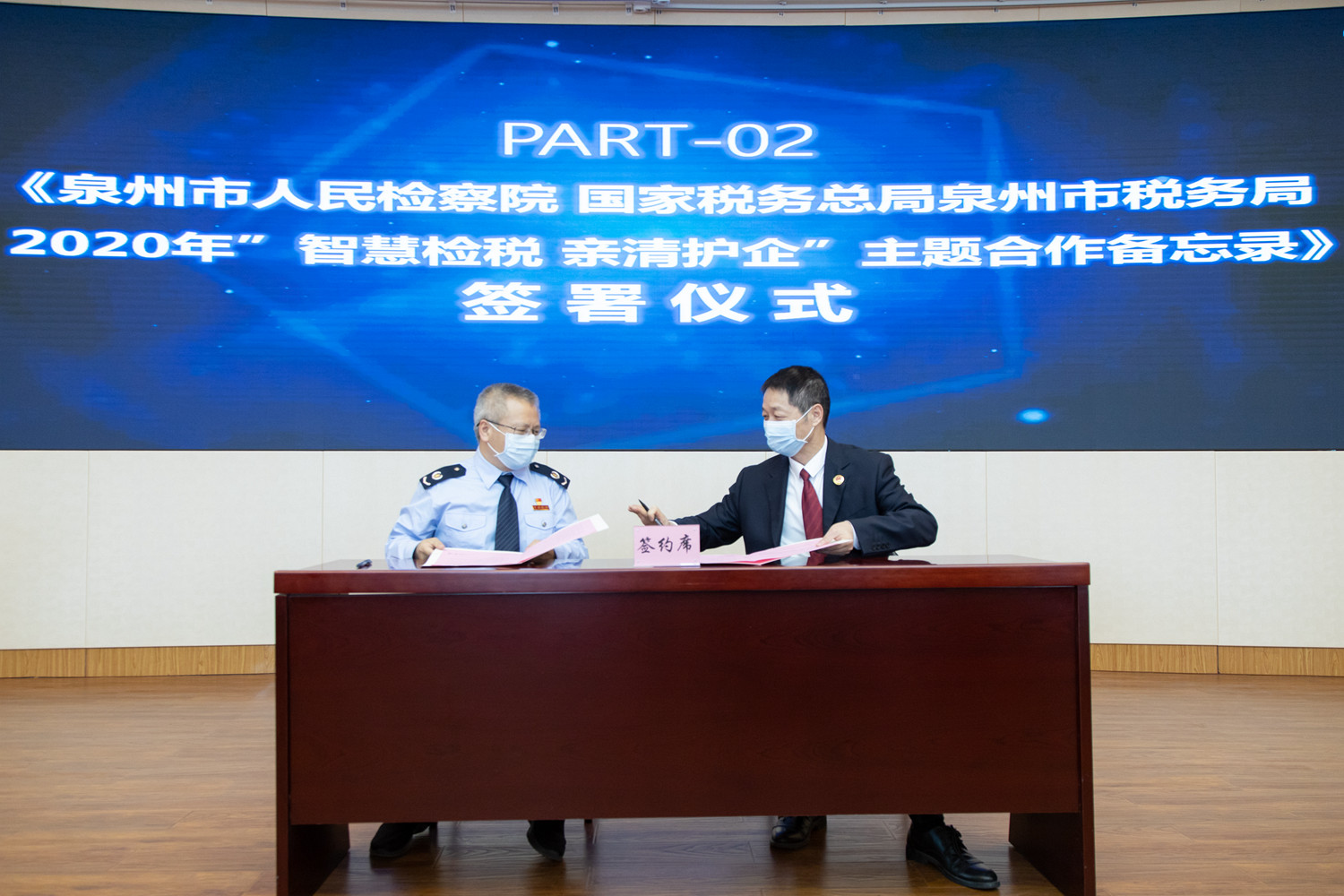 发布会现场,泉州市人民检察院傅建飞检察长与泉州市税务局局长沈家骏共同签署了《泉州市人民检察院 泉州市税务局2020年“智慧检税 亲清护企”主题合作备忘录》,拉开了2020年检税双方“八个一”主题合作行动序幕。