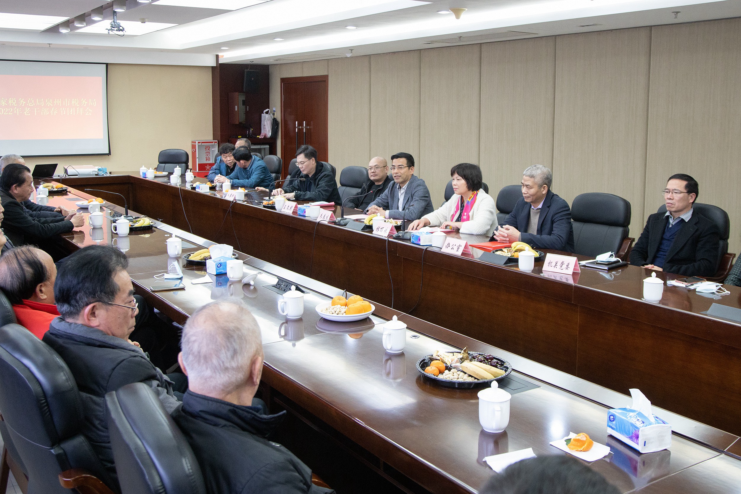 团拜会上,市局党委书记、局长朱春发代表市局党委和全市税务干部职工向各位老同志致以节日的问候,并向大家通报了2021年各项工作的开展情况,分享了2022年工作思路,希望老同志继续关心支持税务工作,发挥余热,为泉州税务事业发展献言献策。老同志们畅所欲言,为一年来泉州税收工作取得的成绩感到由衷的自豪和骄傲,对市局党委对老同志的关心表示感谢。