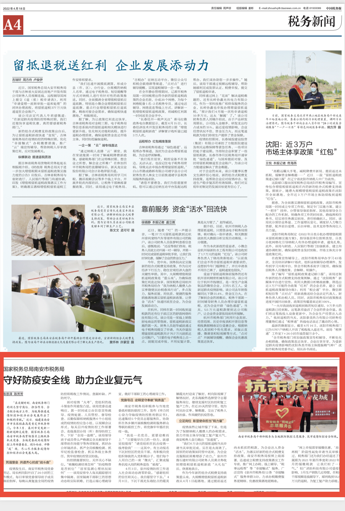 “网上申报即享缓缴优惠,‘房土两税’阶段性减免申请当天审核通过,税务部门还为我们办结退还了所属期为2021年第四季度和2022年1月的缓缴税款,让我们松了一口气。”恒广消防科技有限公司受疫情影响,3月生产销售几近停摆,在税务干部视频连线辅导下,顺利收到55.87万元的退税,为复工复产助力添能。