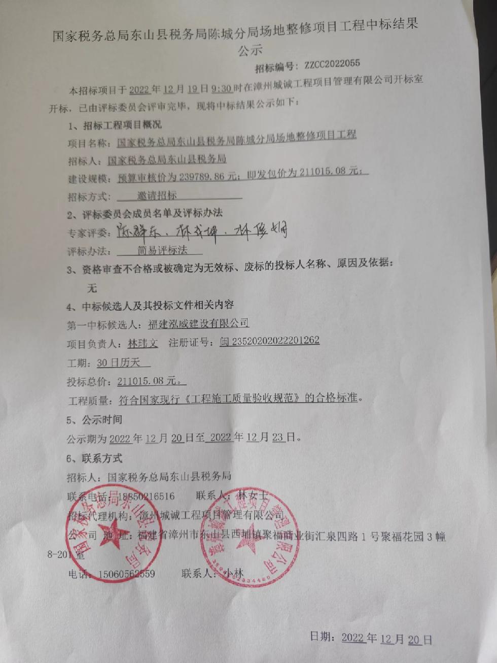 国家税务总局东山县税务局陈城分局场地整修项目工程中标结果公示