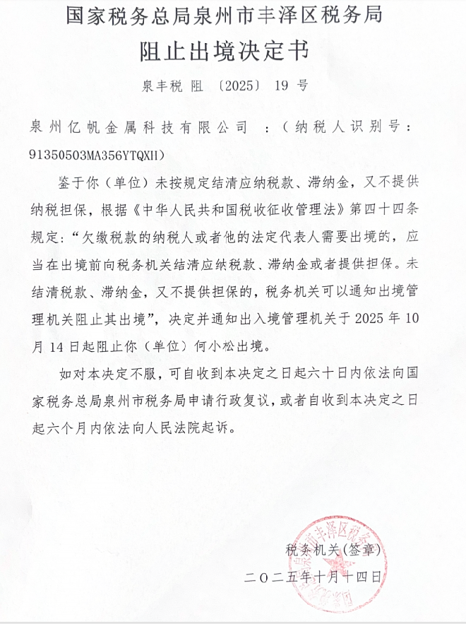 我局对你(单位)作出《阻止出境决定书》(泉丰税阻 〔2025〕19号)。由于你(单位)失联,无法以直接、委托、留置、邮寄的方式送达,现根据《中华人民共和国税收征收管理法实施细则》第106条规定,将下列文书予以公告送达。自公告之日起满30日,即视为送达。