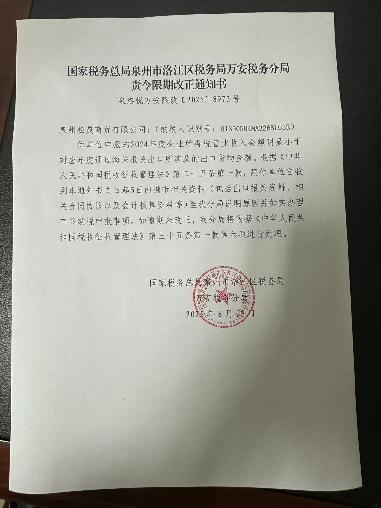 我局万安税务分局于2025年8月28日作出《责令限期改正通知书》(泉洛税万安 限改 〔2025〕 8973 号),因采用其他送达方式无法送达,现根据《中华人民共和国税收征收管理法实施细则》第一百零六条第(二)项规定,将上述文书予以公告送达,自公告之日起满30日,即视为送达。