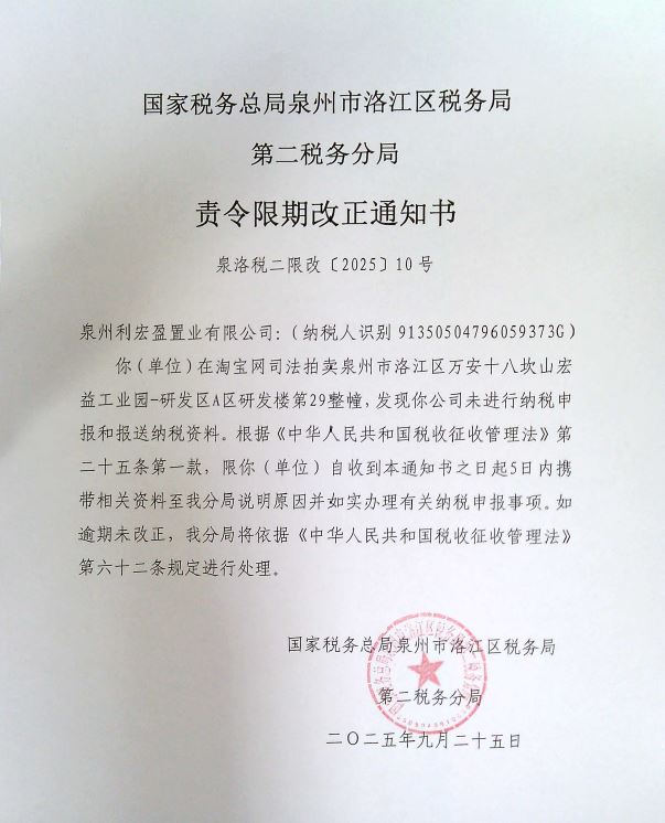 我局第二税务分局于2025年9月25日作出《责令限期改正通知书》(泉洛税二限改〔2025〕10号),因采用其他方式无法送达,现根据《中华人民共和国税收征收管理法实施细则》第一百零六条第(二)项规定,将上述文书予以公告送达,自公告之日起满30日,即视为送达。