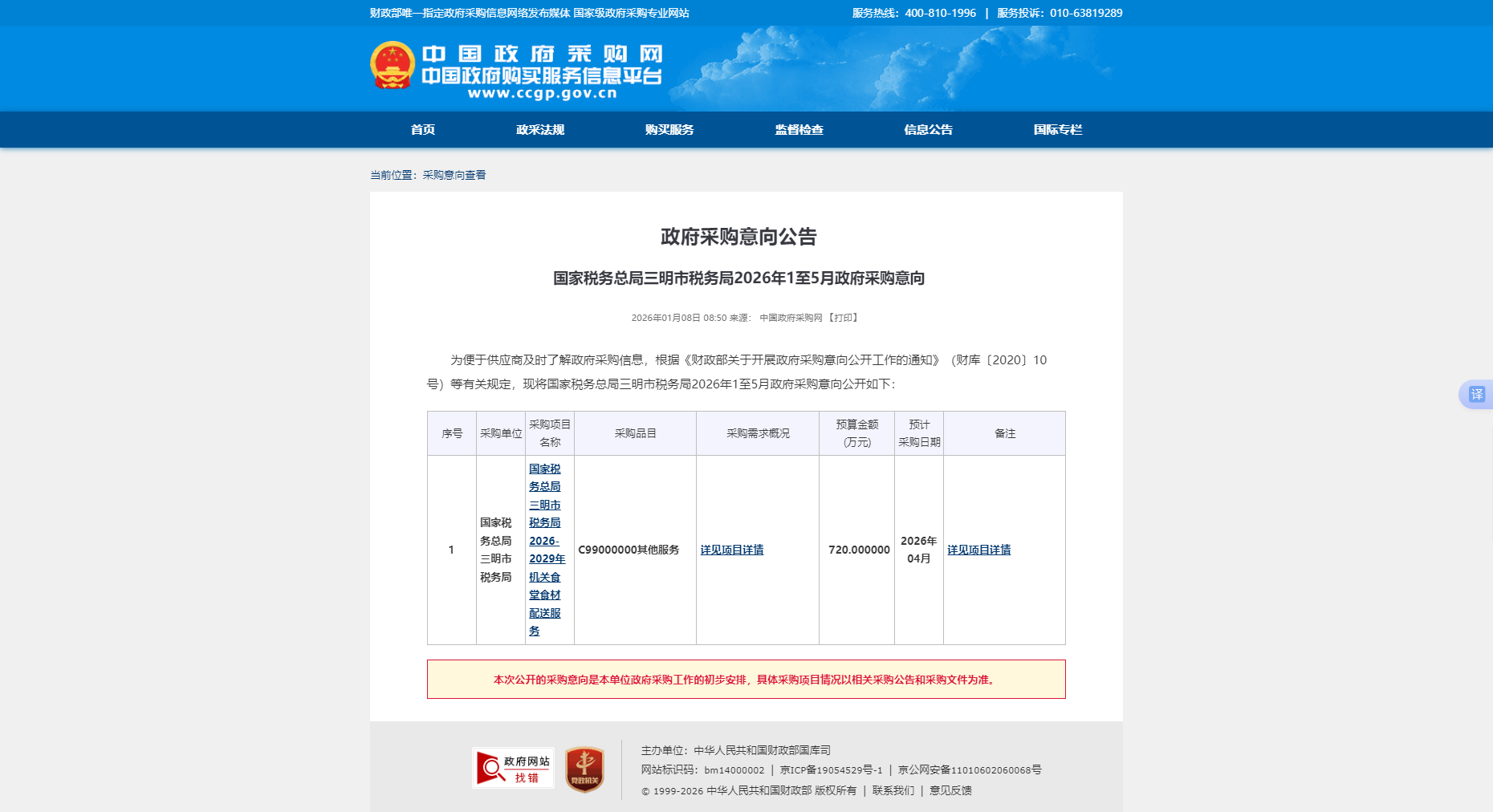 国家税务总局三明市税务局2026-2029年机关食堂食材配送服务项目采购意向