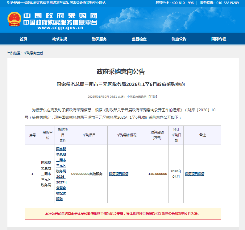 国家税务总局三明市三元区税务局2026-2027年食堂食材配送服务项目采购意向